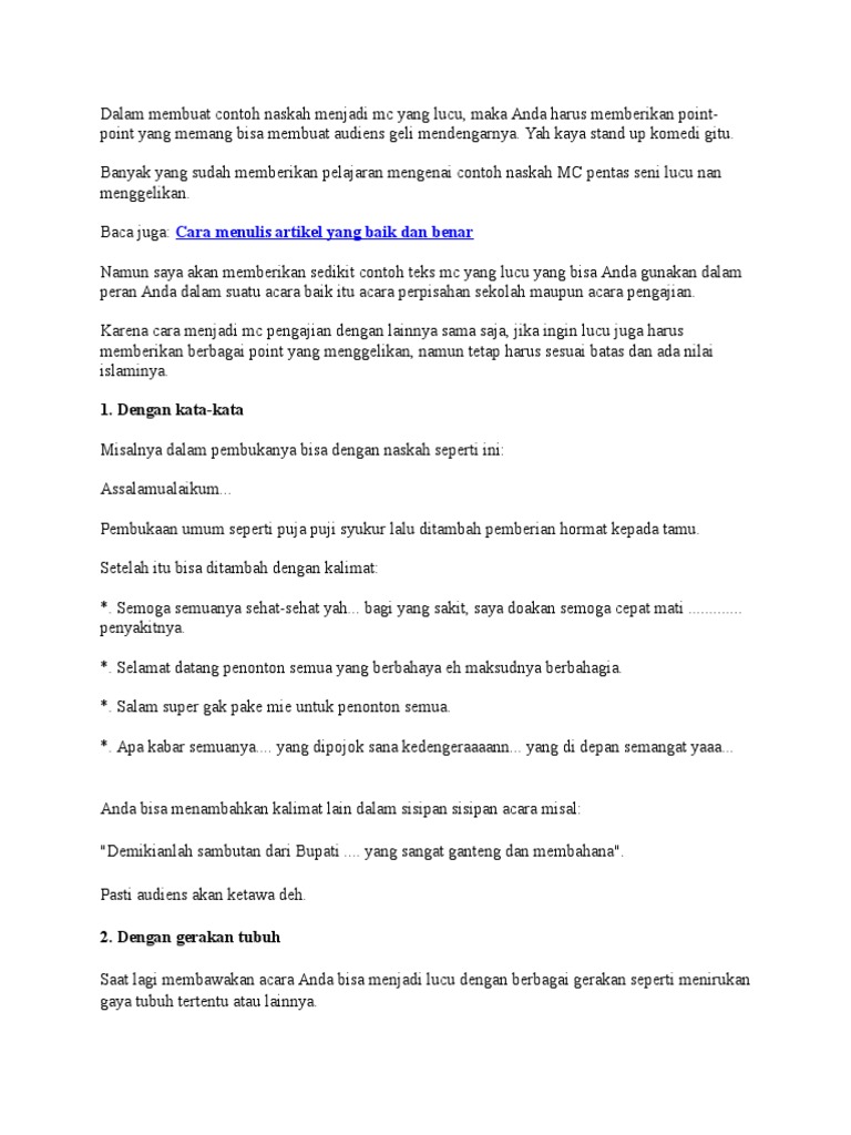 Temukan contoh mc yang anda cari di sini ! Bila waktu persiapan sangat terbatas, tulis naskah mc secara detil, lalu print pada kertas berukuran. Contoh teks mc acara seminar anti narkoba. Contoh teks pembawa acara mc resmi youtube. Contoh naskahteks sambutan sebagai pembawa acara mc contoh teks pembawa acara menjadi pembawa acara atau mc sebenarnya bukanlah hal yang sulit hanya saja bagi anda yang sebelumnya belum pernah mencobanya mungkin anda masih rada gugup dan kurang inspiratif dalam.